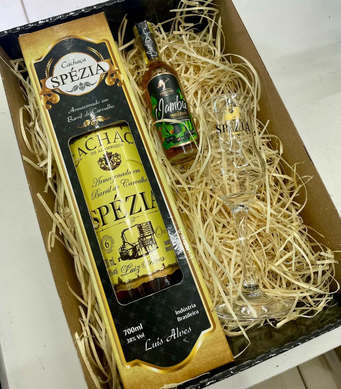Kit Presente - Cachaça Spezia Ouro 6 Anos + Taça Spezia Vidro 60ml + Cachaça Indiazinha Jambu 50ml
