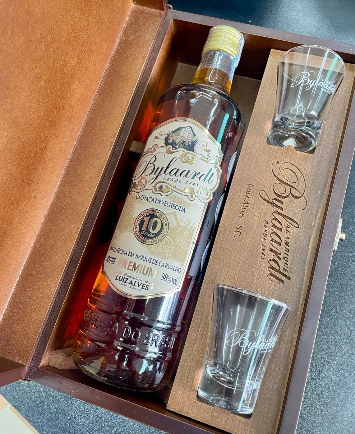 Estojo Bylaardt, Caixa de Madeira, interno madeira, com 1x Cachaça Bylaardt Ouro Carvalho Premium 10 Anos 700ml + 2 Copos Vidro Bylaardt 60ml