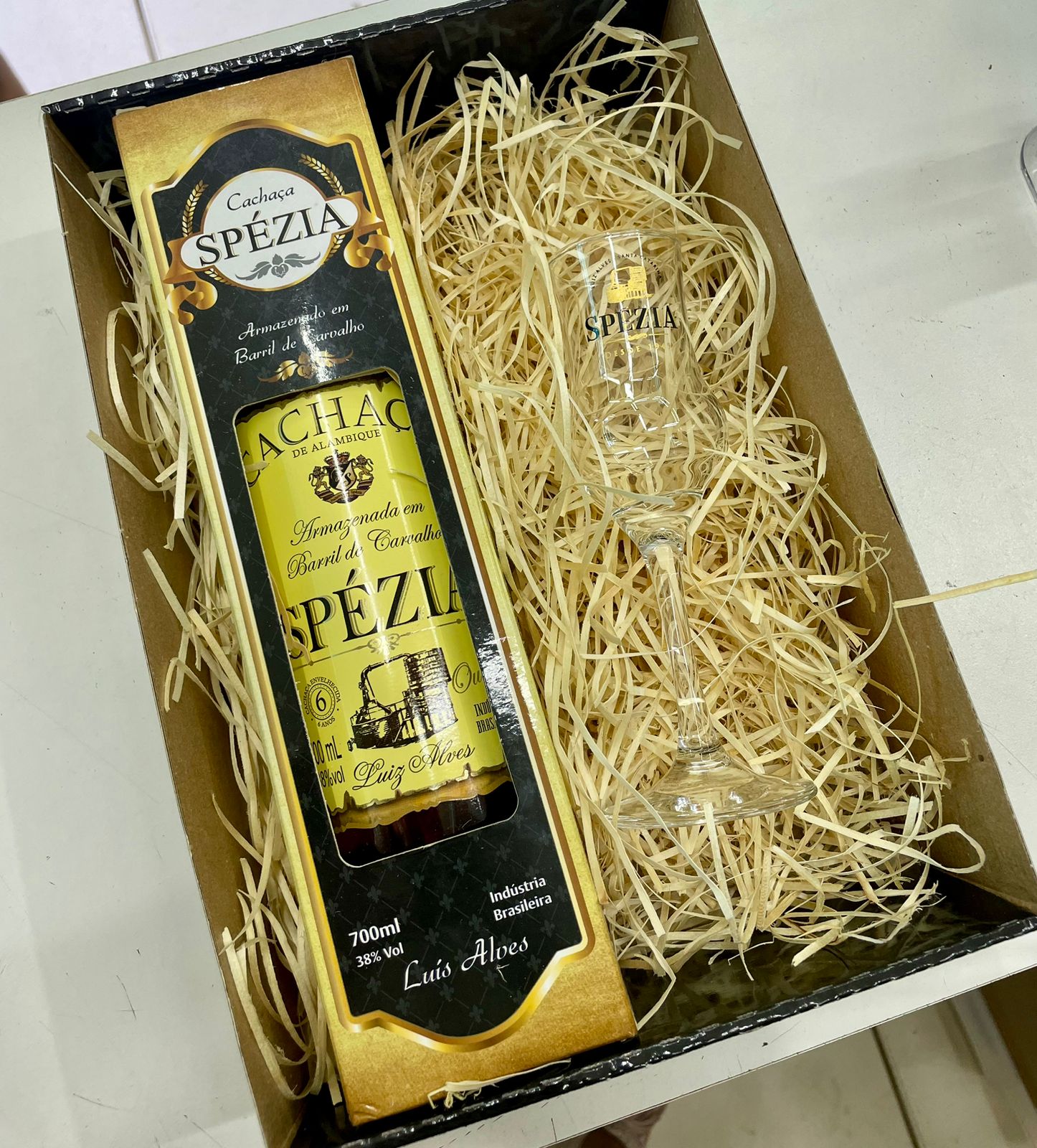 Kit Presente - Cachaça Spezia Ouro 6 Anos 700ml + Taça Spezia Vidro 60ml + Cachaça Indiazinha Jambu 50ml