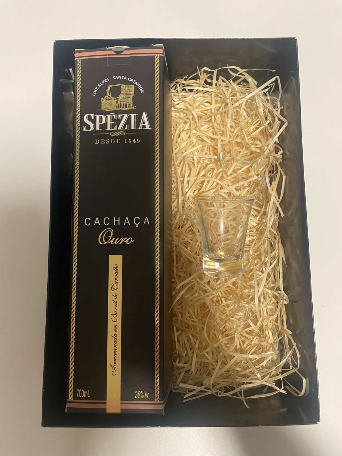 Kit Presente - Cachaça Spezia Ouro 5 Anos 700ml + Copo Vidro 50ml