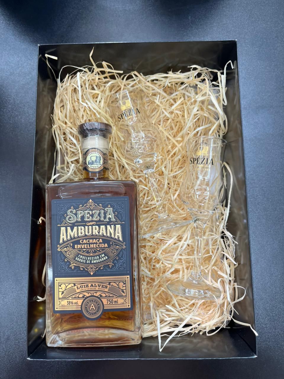 Kit Presente - Cachaça Spezia Amburana 3 Anos 750ml + 2x Taças Spezia Vidro 60ml